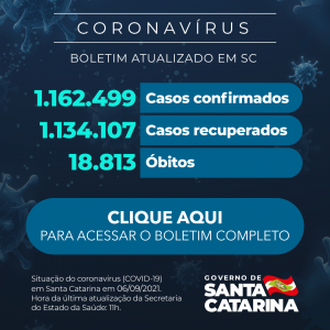 Boletim Novo Coronavírus – Covid-19 – 1.162.499 casos (06 de setembro 2021) Postado em 6 de setembro de 20216 de setembro de 2021 por Fabrício Escandiuzzi Clique aqui para fazer o download do boletim completo Clique aqui para acessar os dados completos