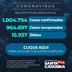 Boletim Novo Coronavírus – Covid-19 – 1.004.794 casos (12 junho 2021) Postado em 12 de junho de 202112 de junho de 2021 por Renan Secom Clique aqui para acessar os dados completos Clique aqui para fazer o download do boletim